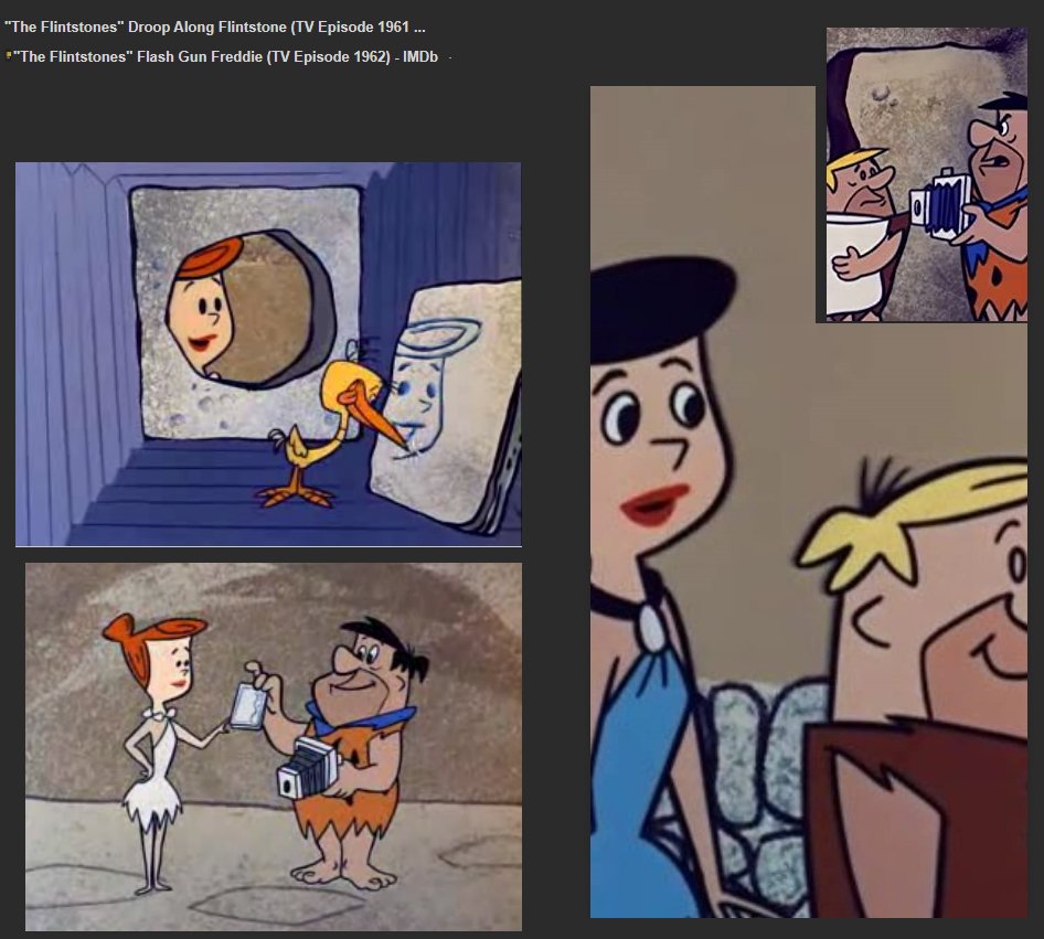 I wonder if anyone of my generation had not seen the activities of Fred and Wilma and their next-door neighbors and best friends, Barney and Betty Rubble (Geröllheimer). The continuing popularity of the series “rests heavily on its juxtaposition of modern everyday concerns in the Stone Age setting” and many gags draw their comic from the point, that animals are doing the machines. Just so in the episode "Flash Gun Freddie" (December 21, 1962), when Fred and Barney take up photography as a hobby during their vacation from work. When Fred aims and focuses on Wilma with his „Polarock” instant camera, you can see how inside the box a woodpecker is sculpting her portrait and then Wilma gets her photo.