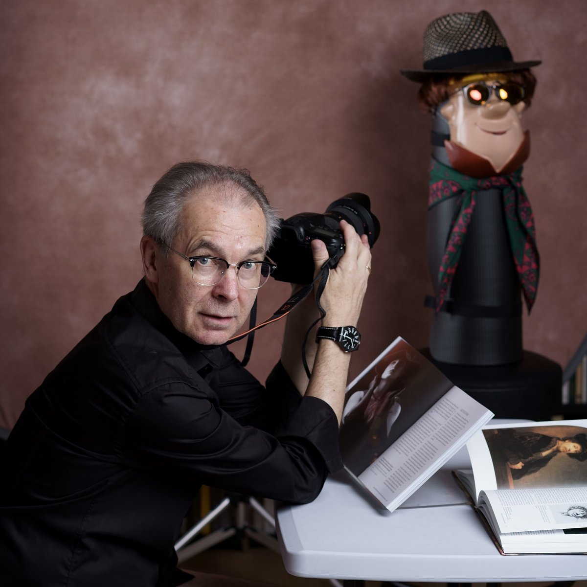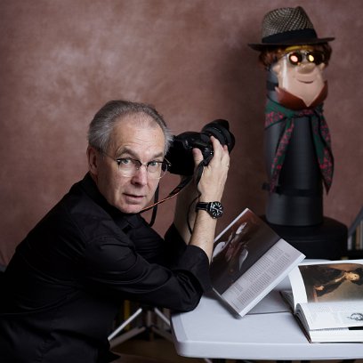 Some time ago I bought a Barney mask in a special shop together with a red-haired wig. When I started my training for studio lighting in 2018, it was good to have it at home to serve as a dummy for focusing in various setups. I only needed to mount it onto a rolled-up gym-mat. Like a friend, Barney did his job very well and bore the longest sessions of practice and different dress ups, I suppose due to his „inveterate cheerfulness“.